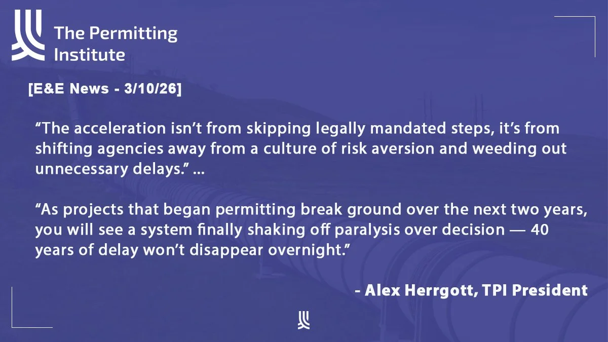 TPI president Alex Herrgott comments on the progress being made to deliver faster and better aligned federal permitting reviews. Read Mike Soraghan's full coverage in E&E News.